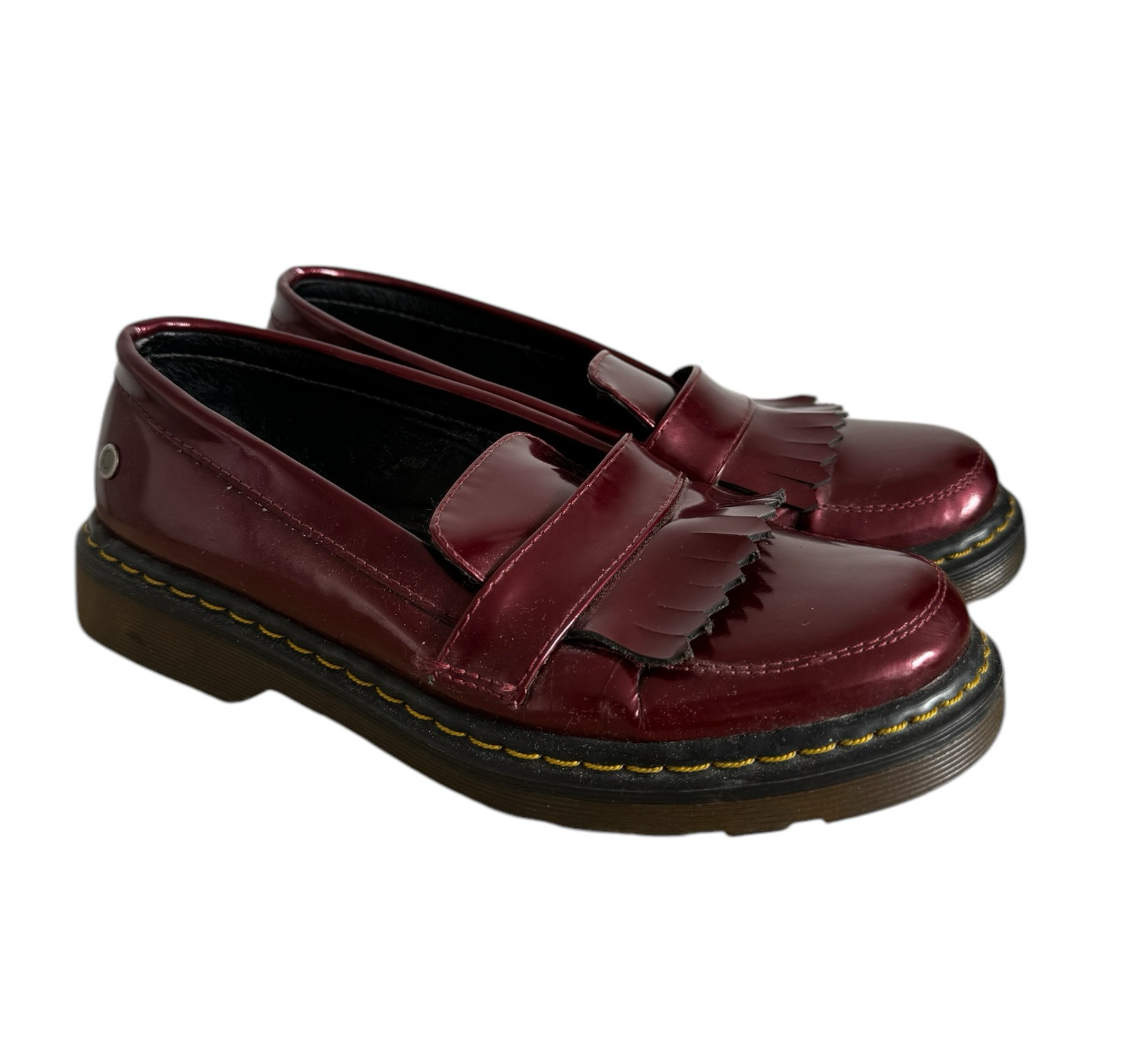 Mocasines en cuero con antifaz, acabado charol, están en muy buen estado.